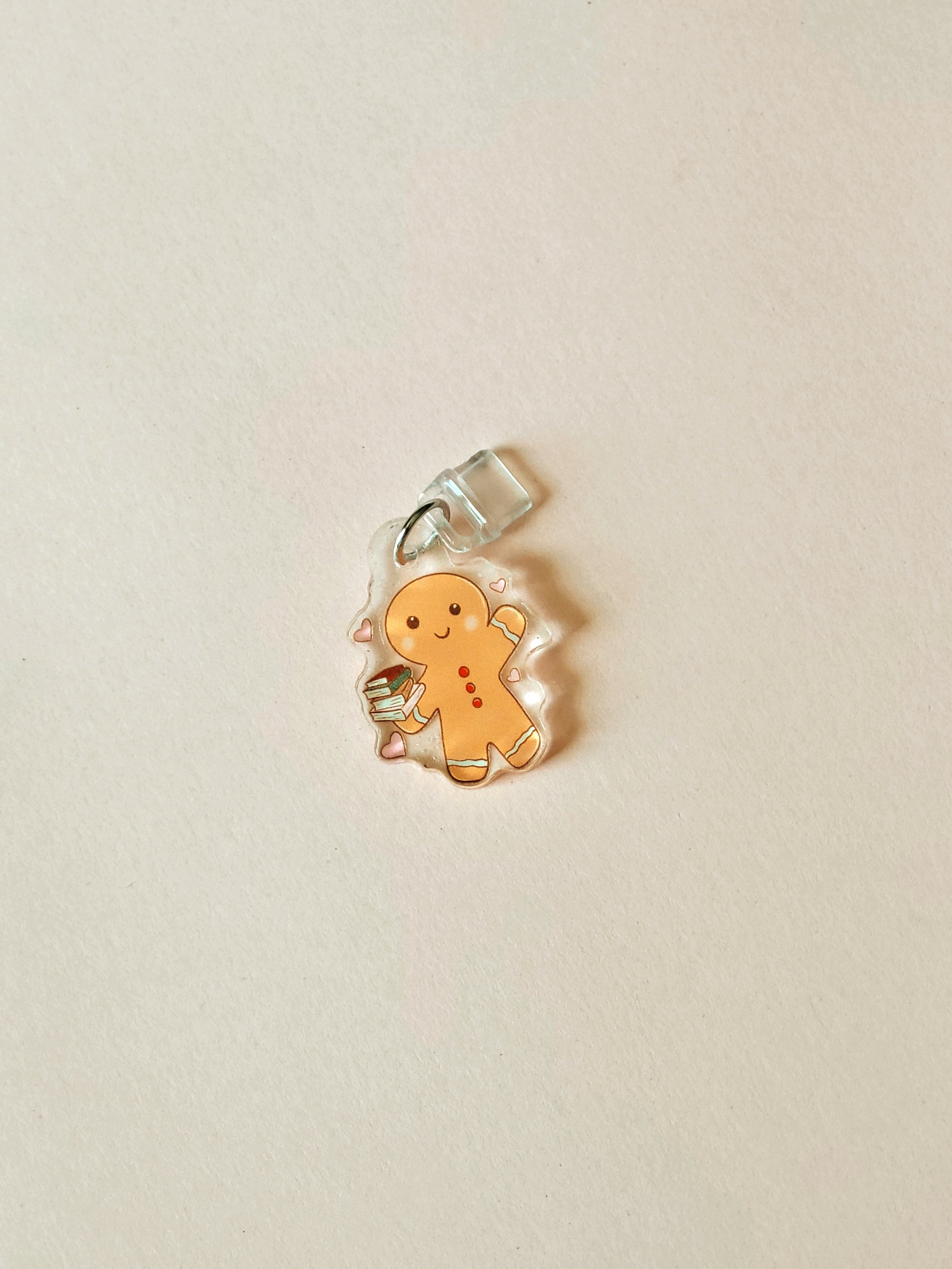 lovers Introducing the Bookish Gingerbread Man charm, perfect for Kindle, Samsung phones, Ipad, and Airpods! This 1"×1" acrylic charm features a cute gingerbread man holding books, making it a must-have for all book lovers. Show off your love for reading with this charming accessory.