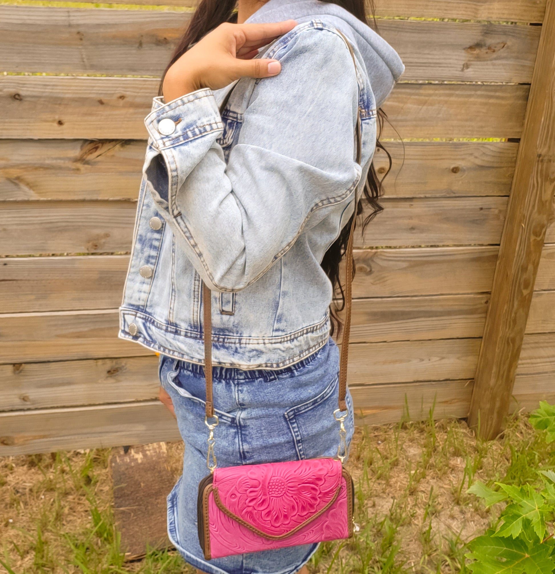 Artesanal, hand tooled, vegan leather, wallet comes with shoulder strap to make it into crossbody purse & a coin purse.